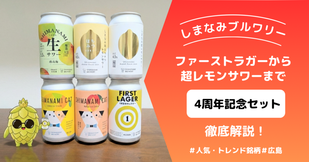 広島の実力ブルワリー「しまなみブルワリー」4周年記念セットを徹底解剖。ラガーはもちろん、人気の超レモンサワーやしまなみキャットまでこの4年間の集大成!ホプ太がそのおいしさをナビゲートしています。 -